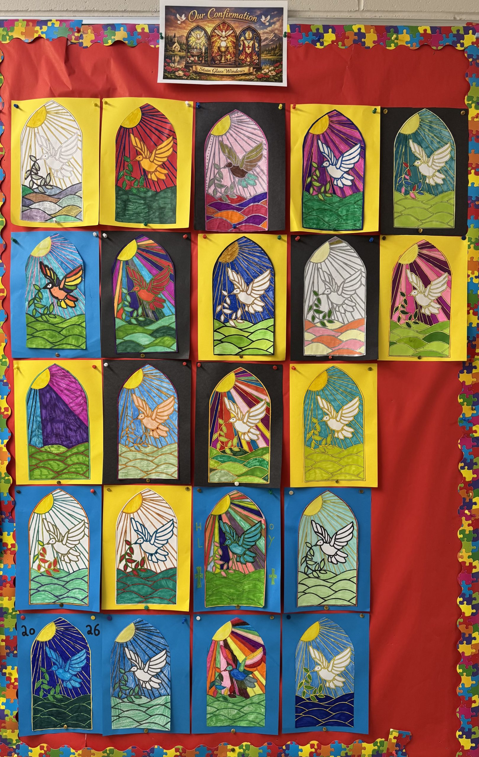 Gorgeous stain glass windows created by the Sixth Class as part of our preparation for Confirmation.